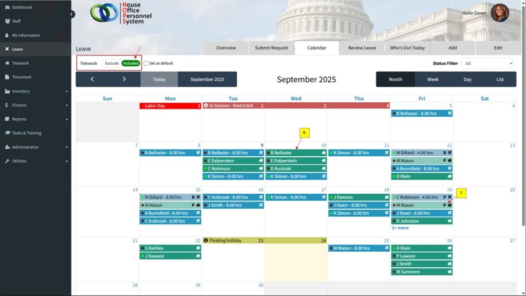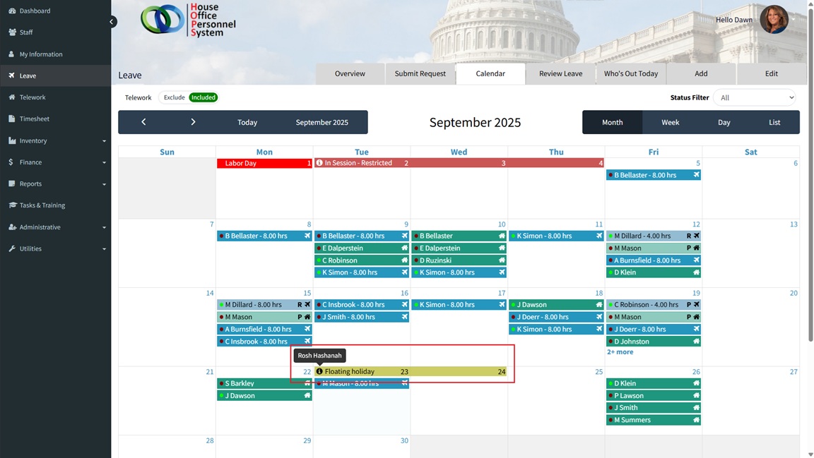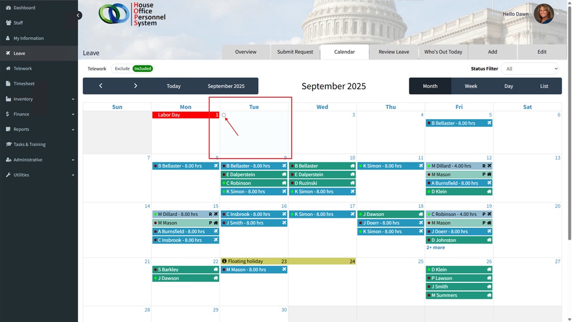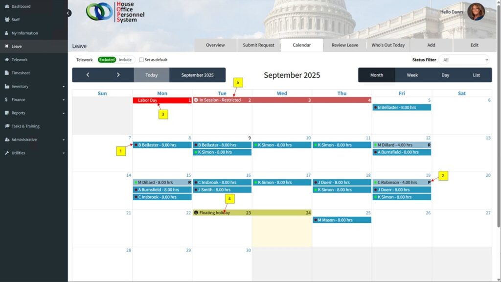 The calendar provides information related to staff absences, scheduled telework, office closures, events, and restrictions for utilization of paid time off (PTO). The calendar can be accessed by selecting [Leave -> Calendar (tab)] from the left navigation menu. The calendar is only visible to staff that have been granted access.
