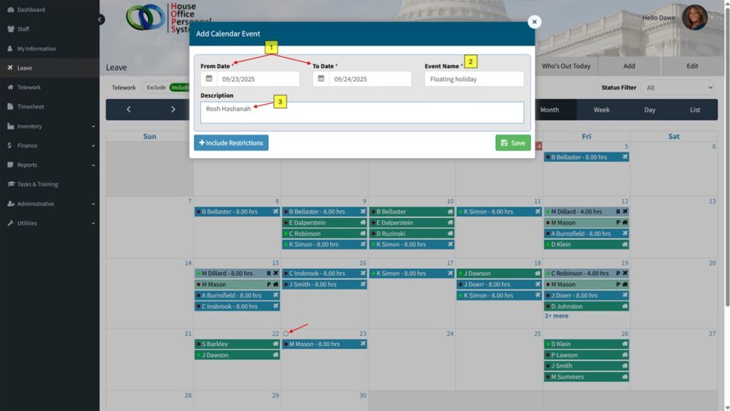 - Restricted Leave Types – A selectable list of leave types that staff are restricted from requesting during the dates of the event being created. The default leave types that are selected for restriction can be modified in the System Settings.
