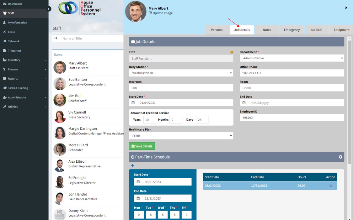 The ‘Job Details’ tab includes detailed information related to the staffers employment. This includes: