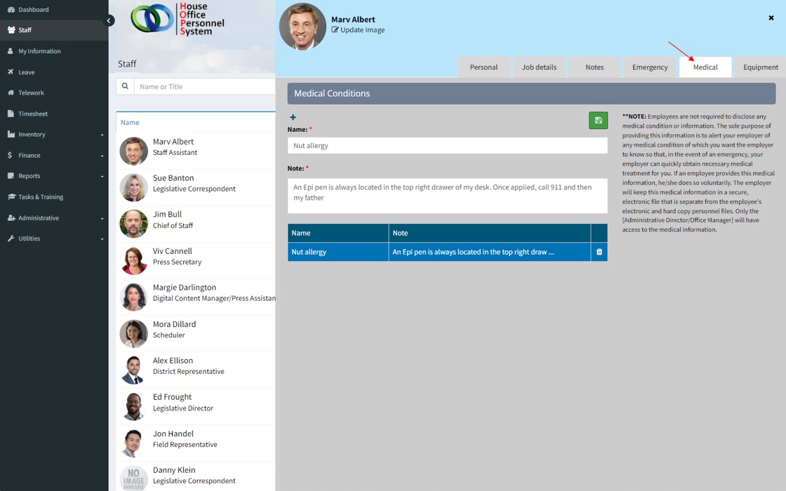 The ‘Medical’ tab allows for managing information regarding serious medical conditions that a staff member may have. This feature ensures that critical health information is readily accessible, facilitating appropriate care and response in medical situations. (Note: The information is optional and should only be made available/accessible to authorized staff, i.e. COS, Emergency Coordinator)