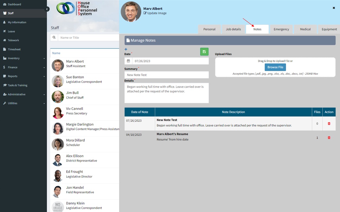 The ‘Notes’ tab is used to manage information related to the selected staffer. In addition to written notes, associated files can be attachedThis feature supports a range of entries, helping keep all necessary details organized and easily accessible.