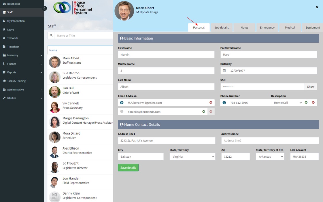 The ‘Personal’ tab displays an overview of the staff member’s basic information. This includes: