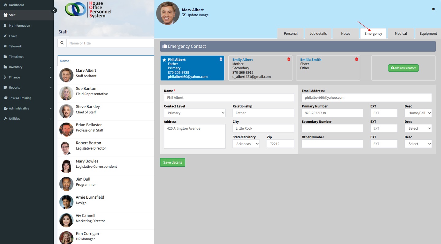 The ‘Emergency’ tab allows for management of emergency contact information for the selected staffer.  There is no limit to the number of emergency contacts that can be added to each profile.  Each emergency contact is displayed as a tile above the form.  The details are displayed below the selected emergency contact tile.